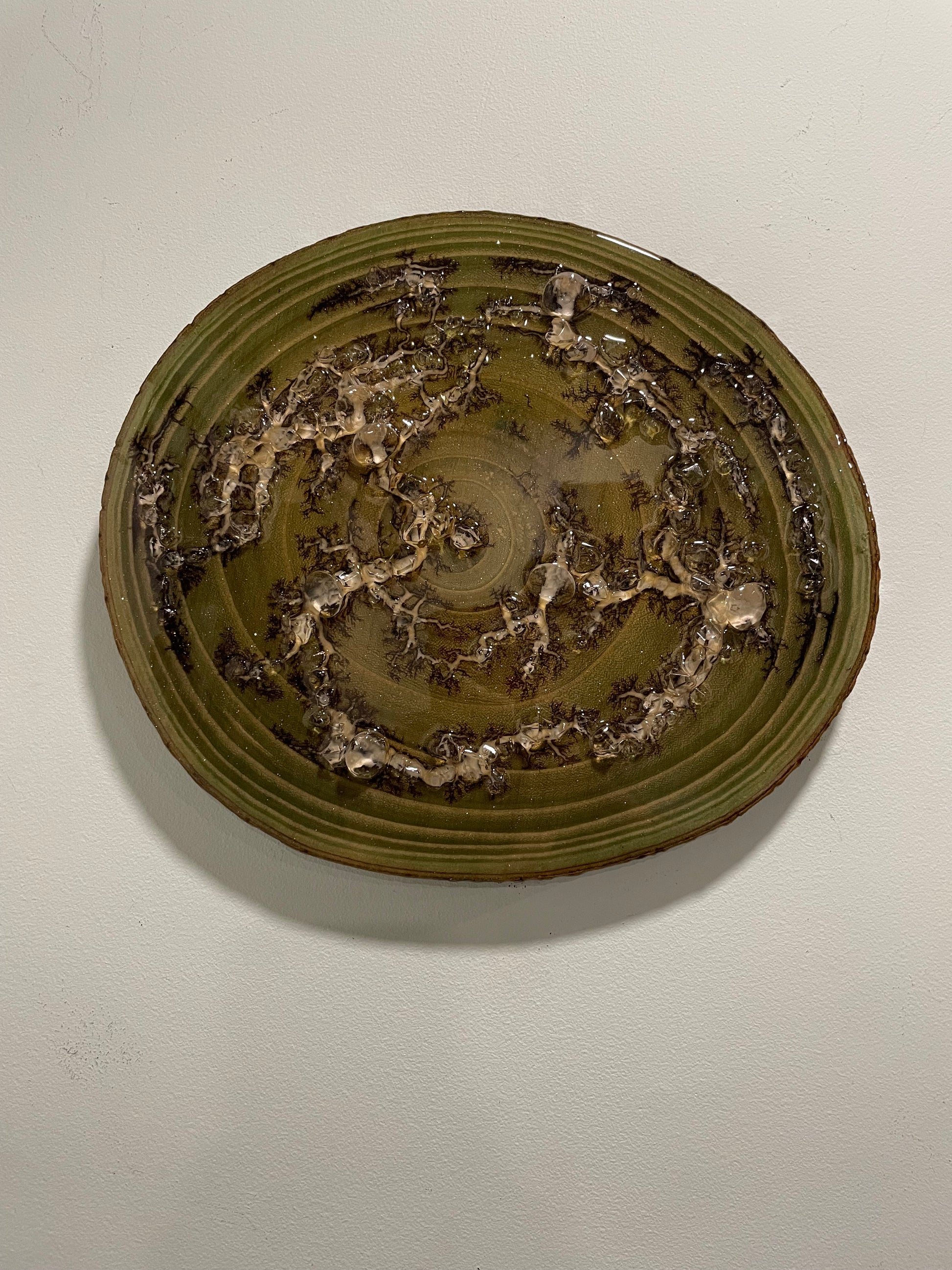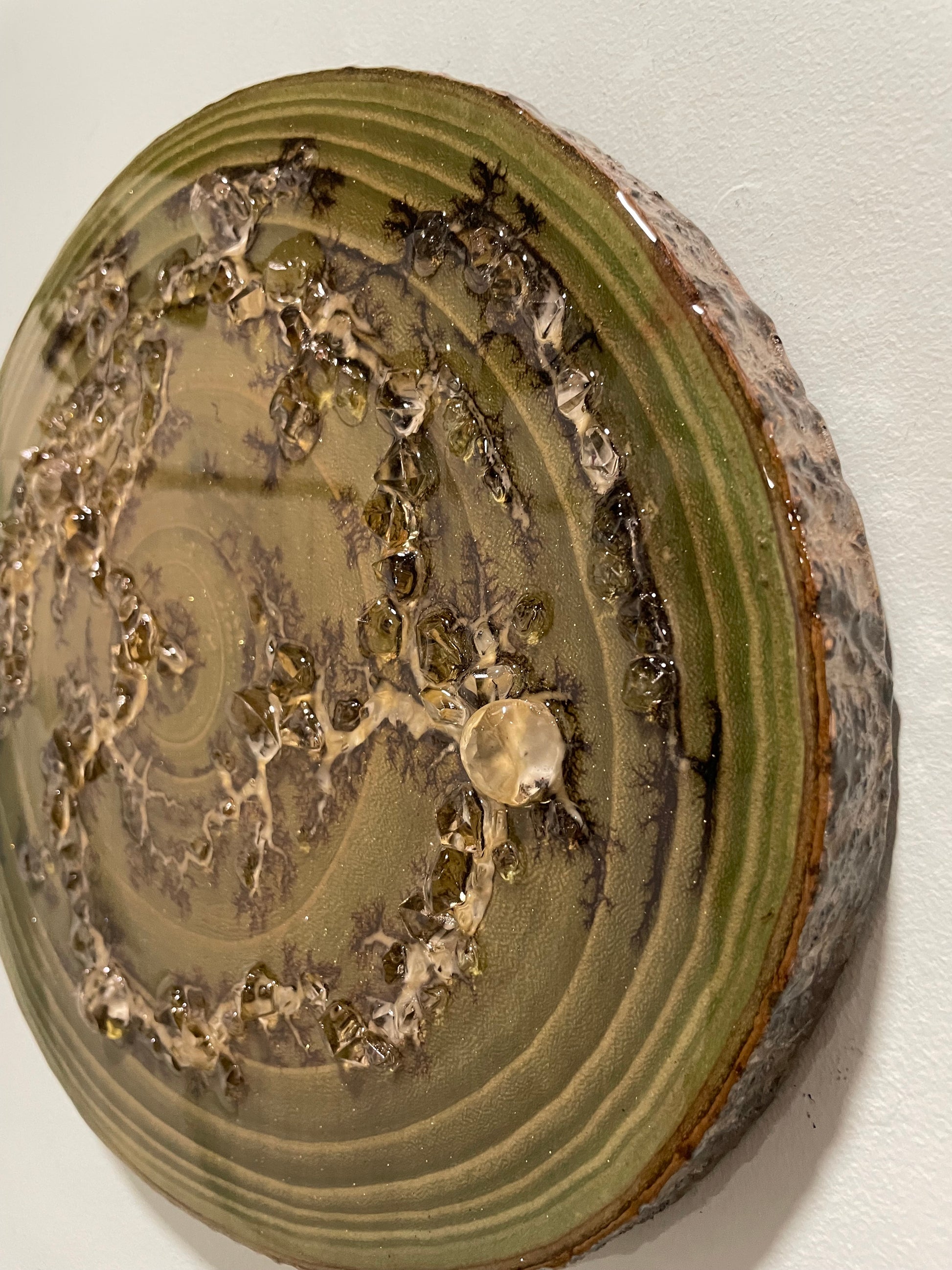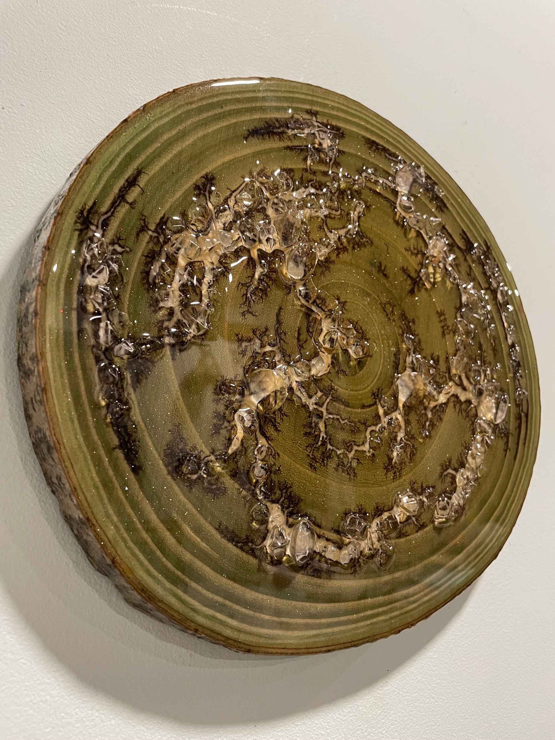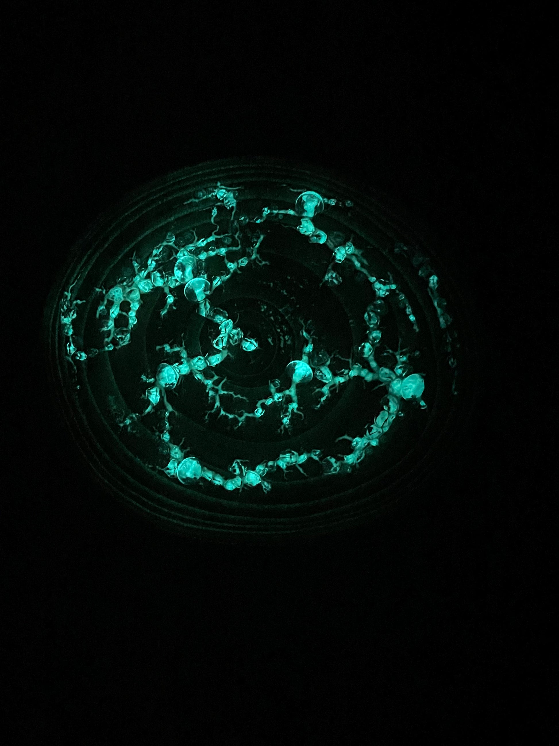 Beautiful green Bitcoin art with all the elements normally seen in my work, but without the Big B, for those who don’t want anyone to know it’s all about Bitcoin! 10-12” round. On wood. Lightning via 12 volts electricity. Glows in dark.