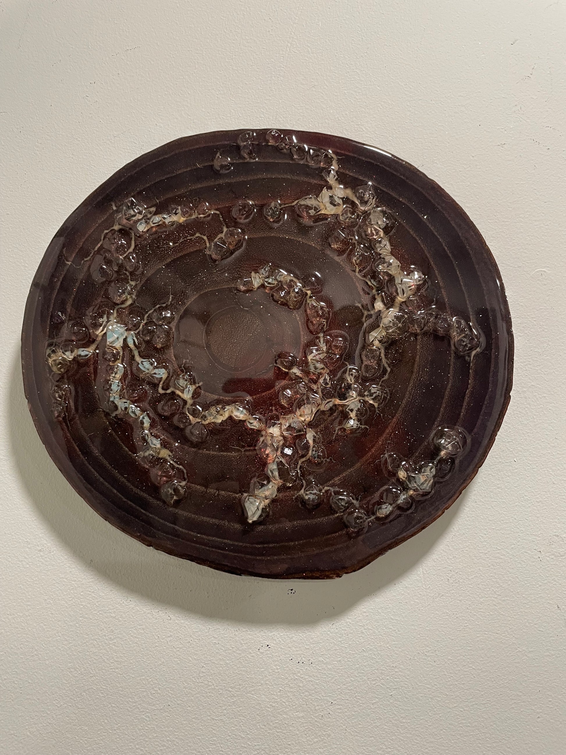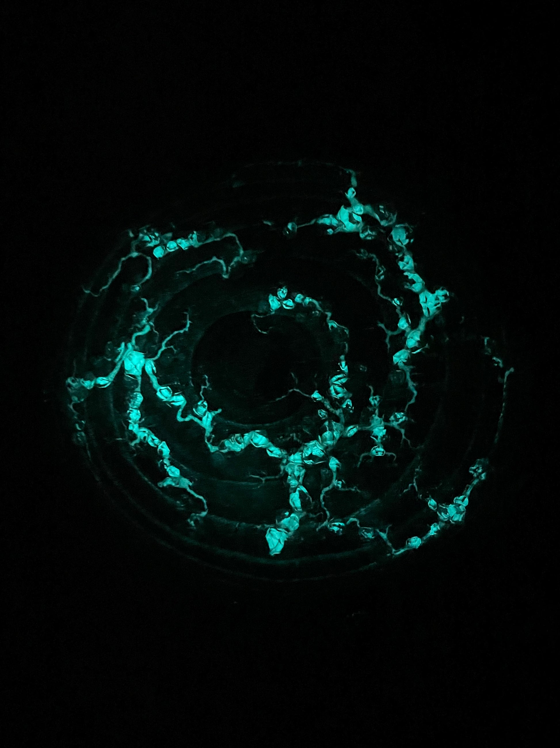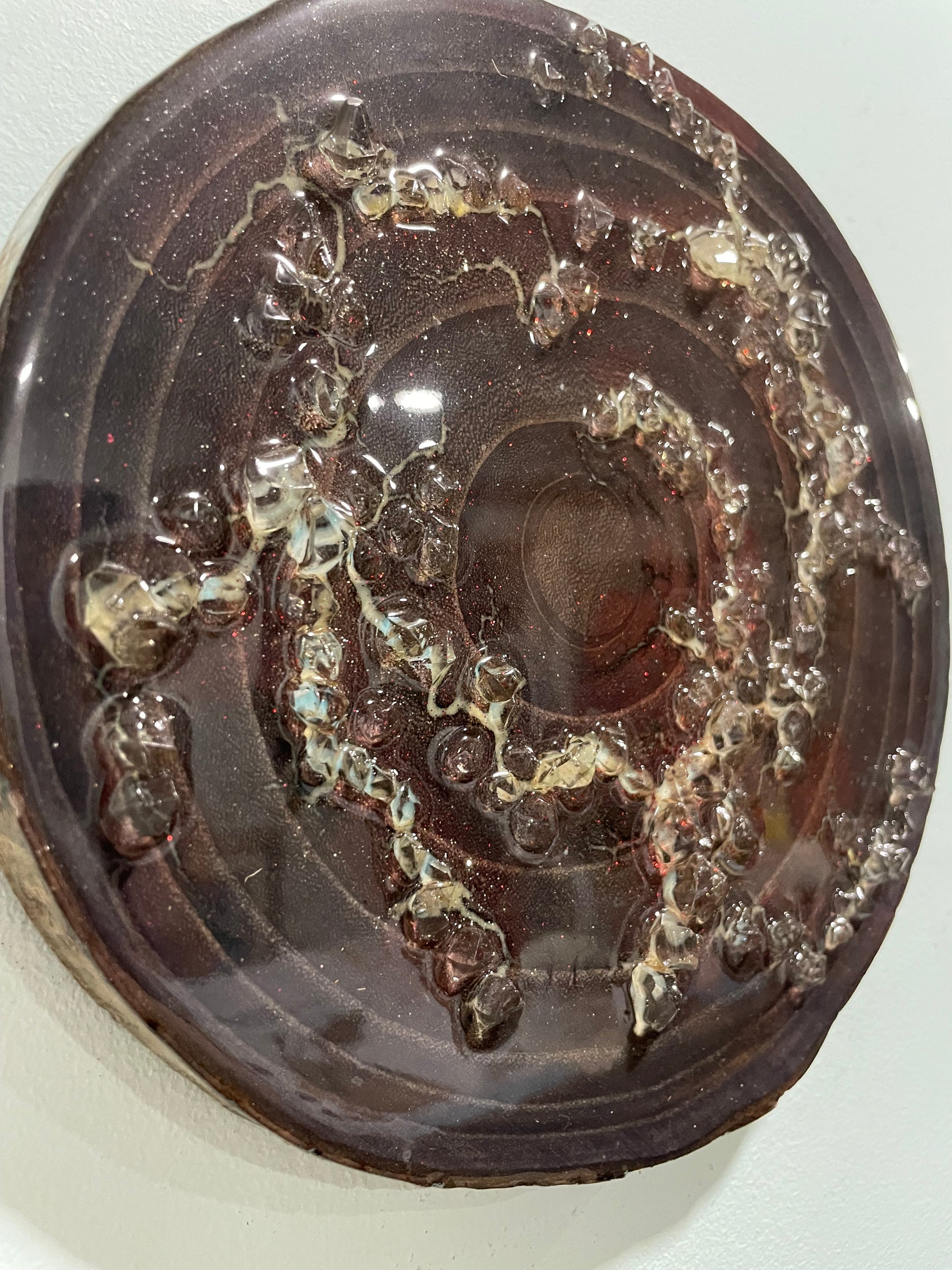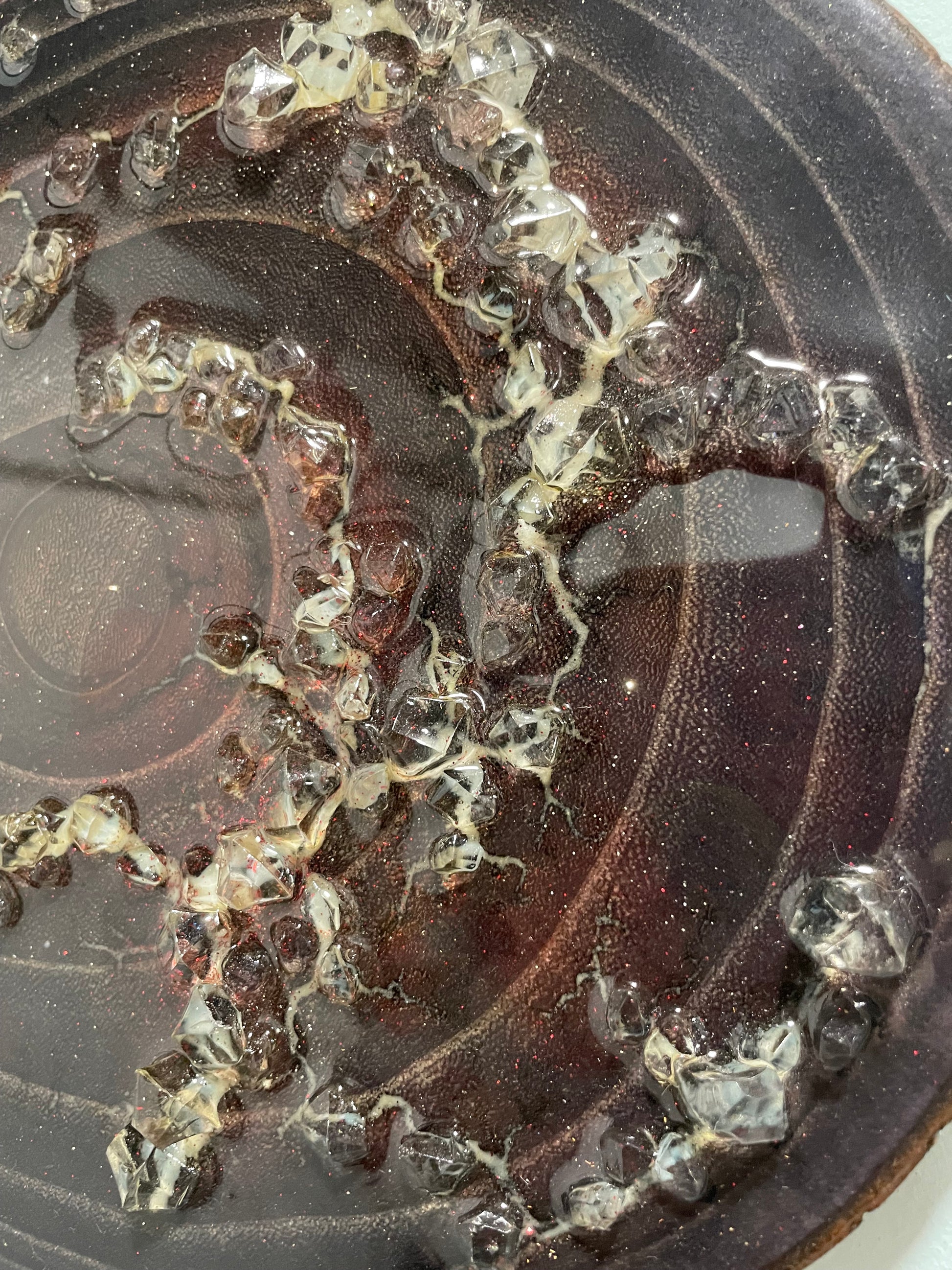 8-10” natural round. On wood. Lightning via 12K volts of electricity. Glows in dark.
