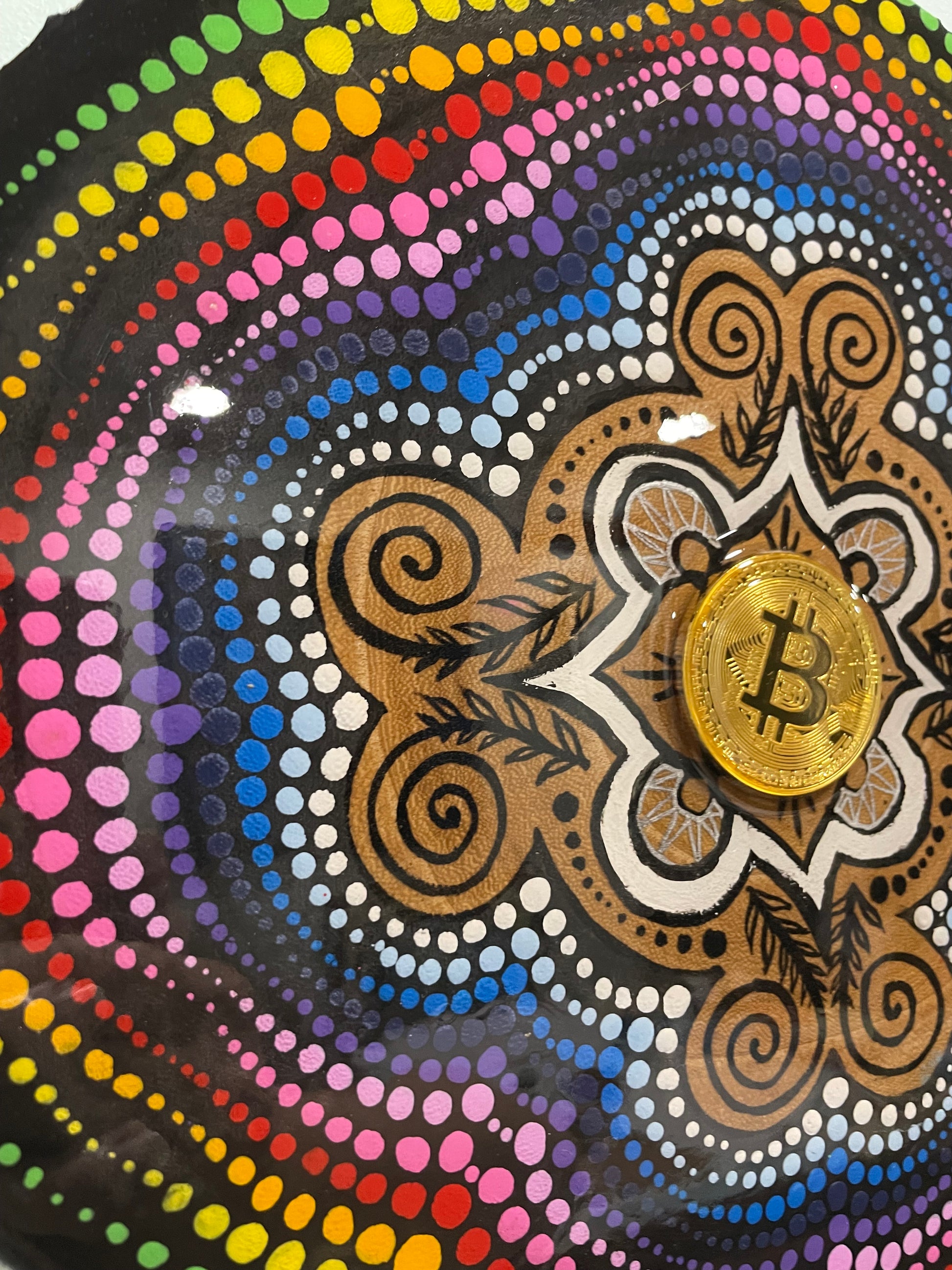 Hand drawn, beautifully colored. Bitcoin coin in center. Final coat with epoxy resin.