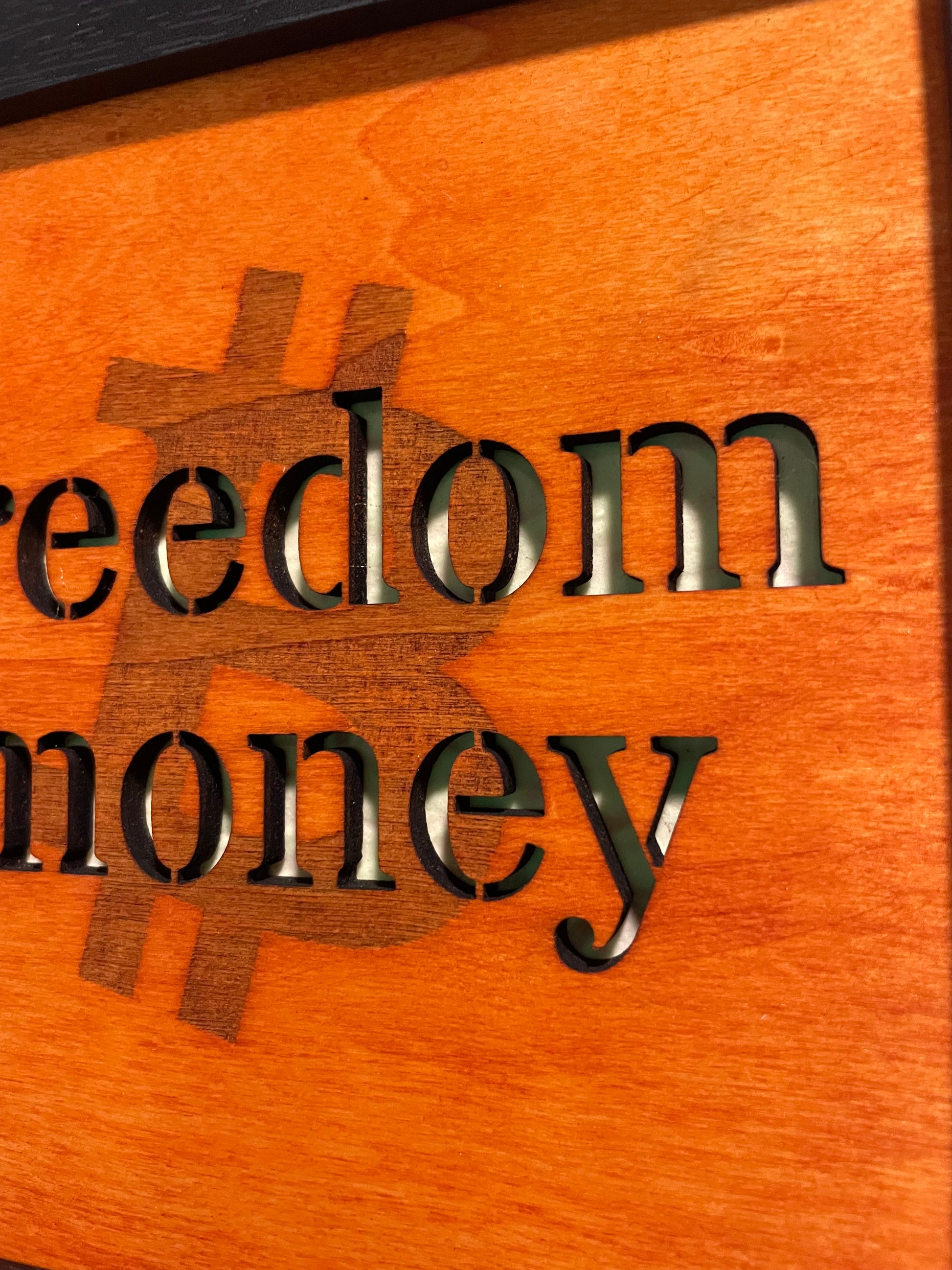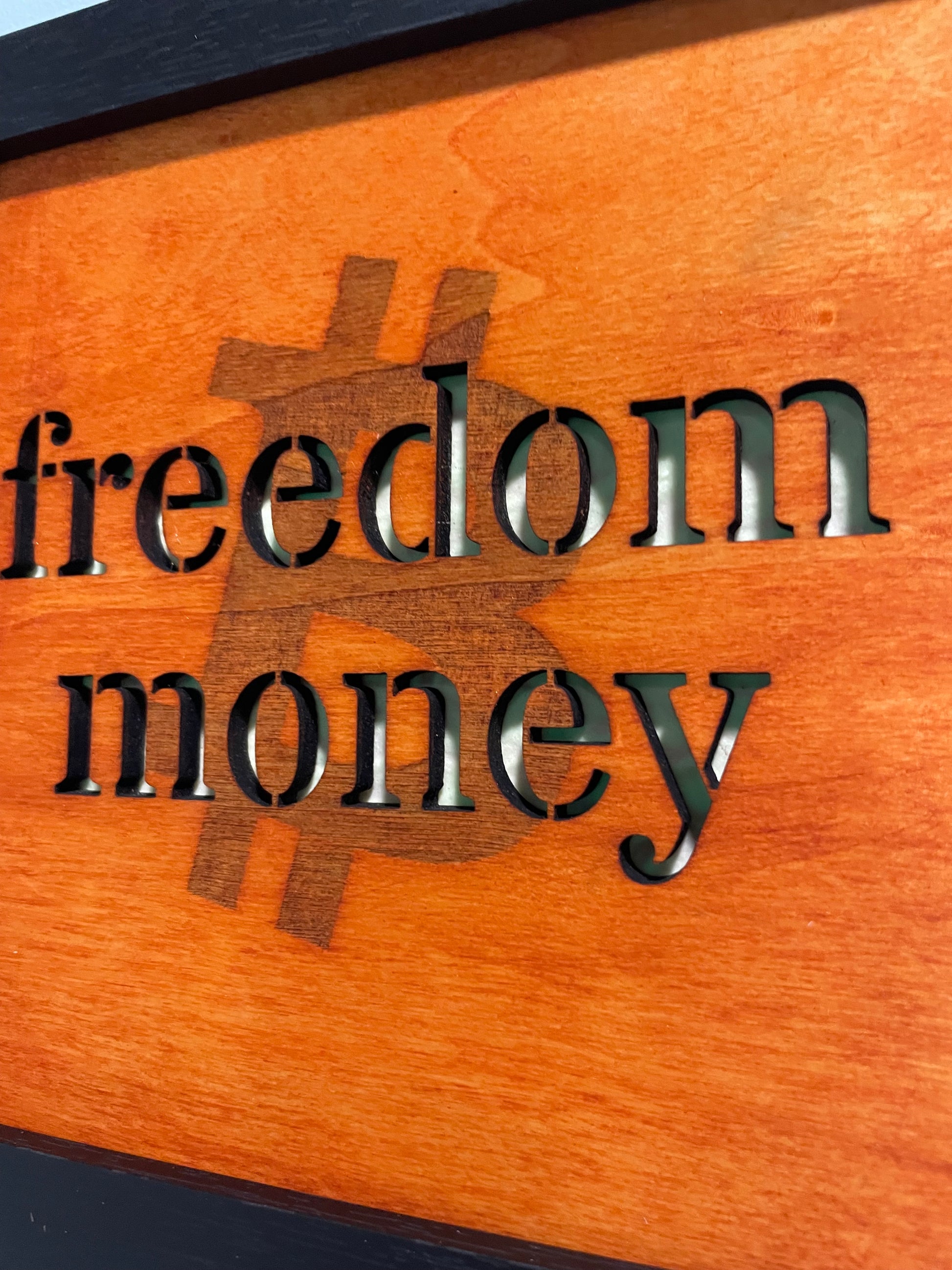 6x6” on wood, stained orange; with freedom money cut out and glows in the dark!