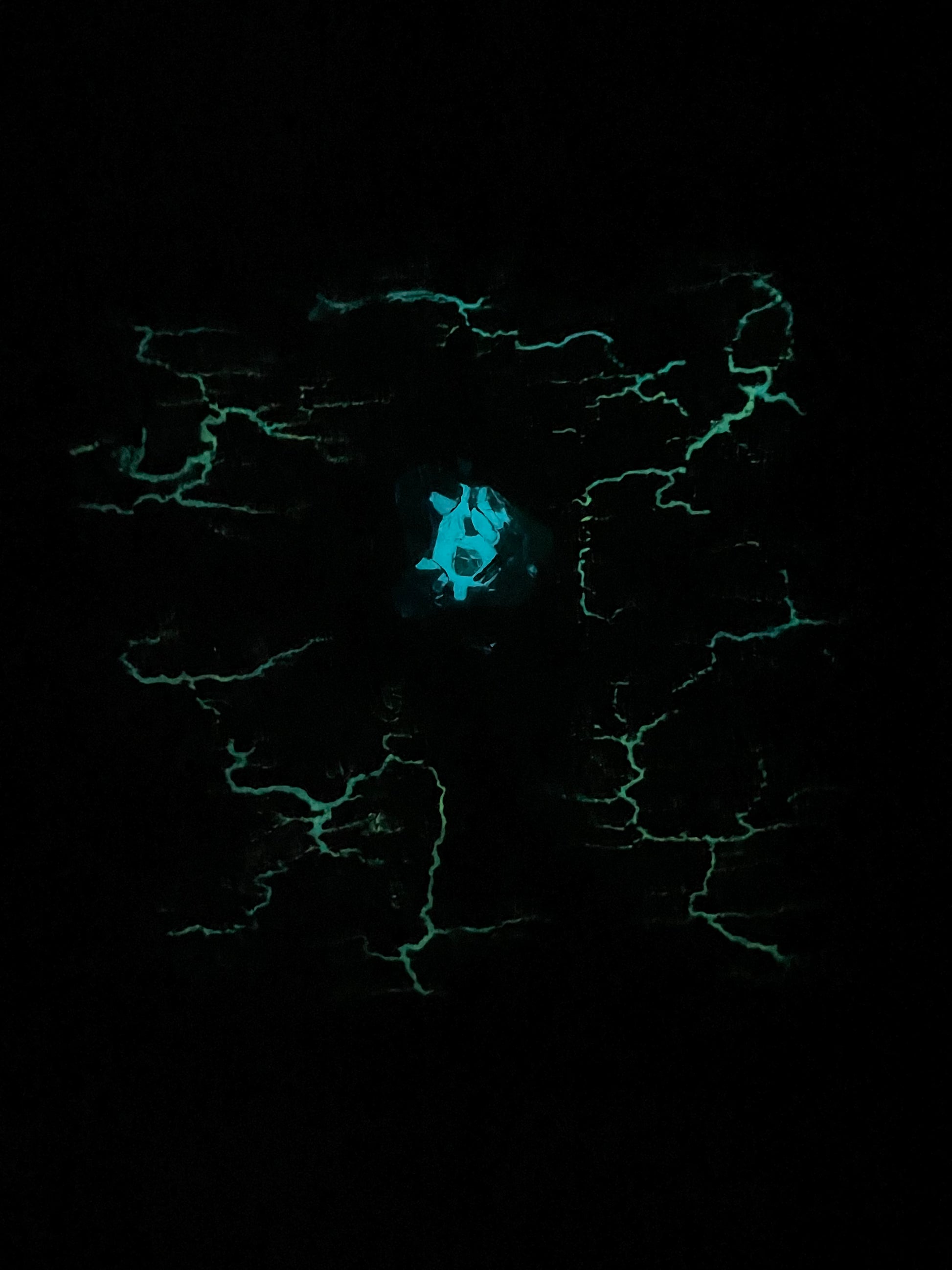 12”square. Lightning via 12K volts of electricity. Epoxy resin finish. Glows in dark.
