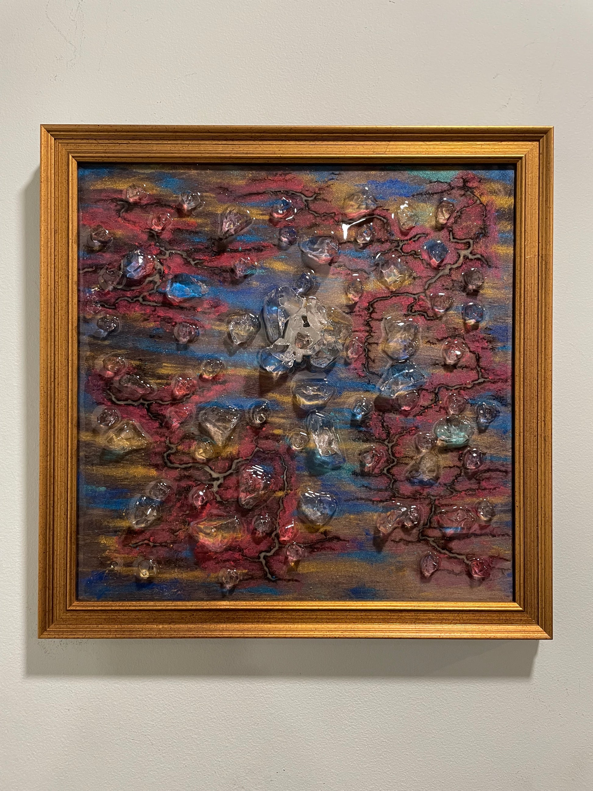 Odd colors for Bitcoin art, blue, gold and pink, but maybe it’s perfect for your place! The B is hidden in the gems, but shows up at night.
