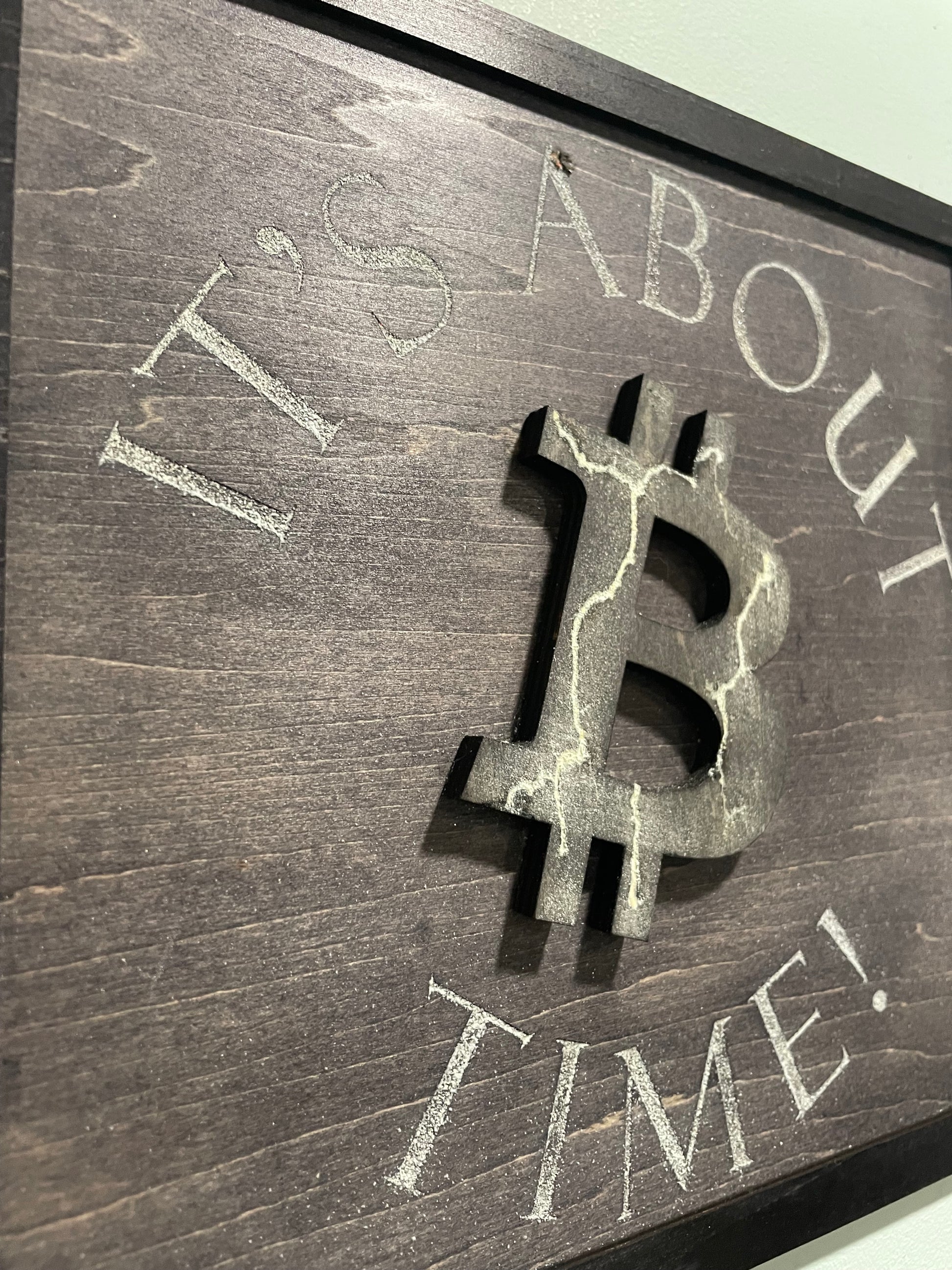 ~9.5” square. On wood. Bitcoin B lightning channels burned with 12K volts of electricity. Glows in the dark.