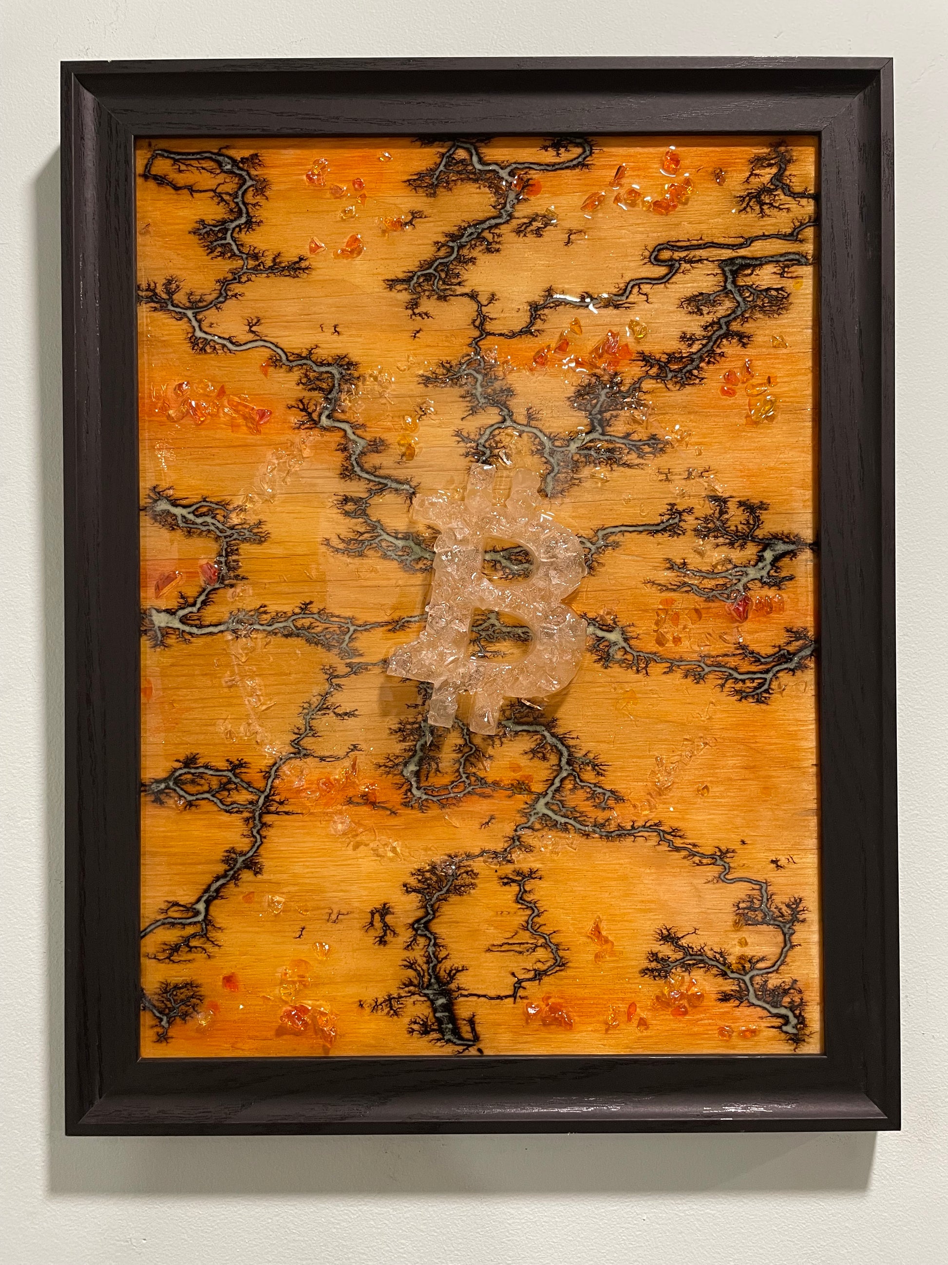 12 x 16” on wood. Lightning via 12K volts of electricity. Epoxy resin finish. Glows in dark. Has faint moon behind the Bitcoin B.