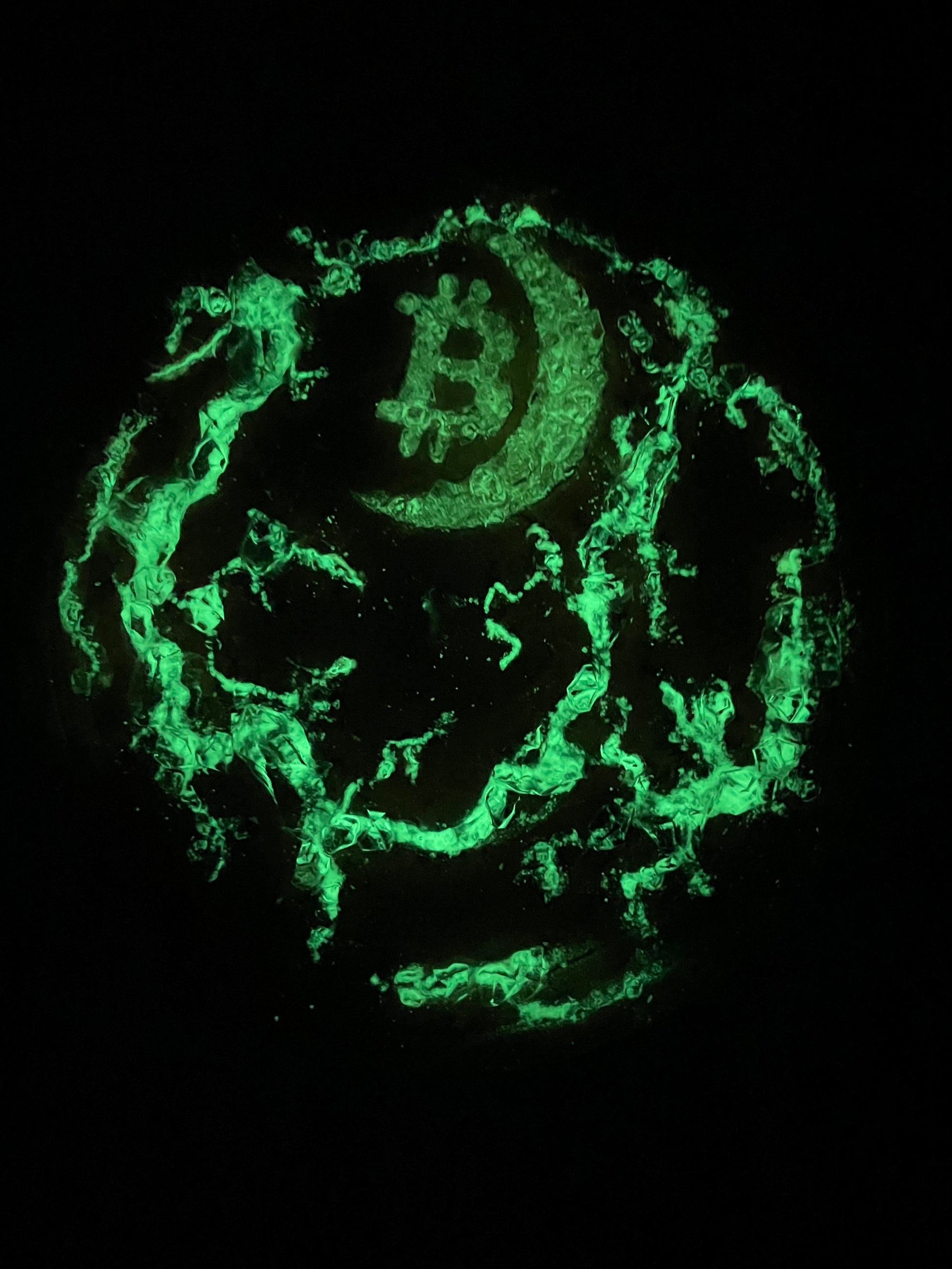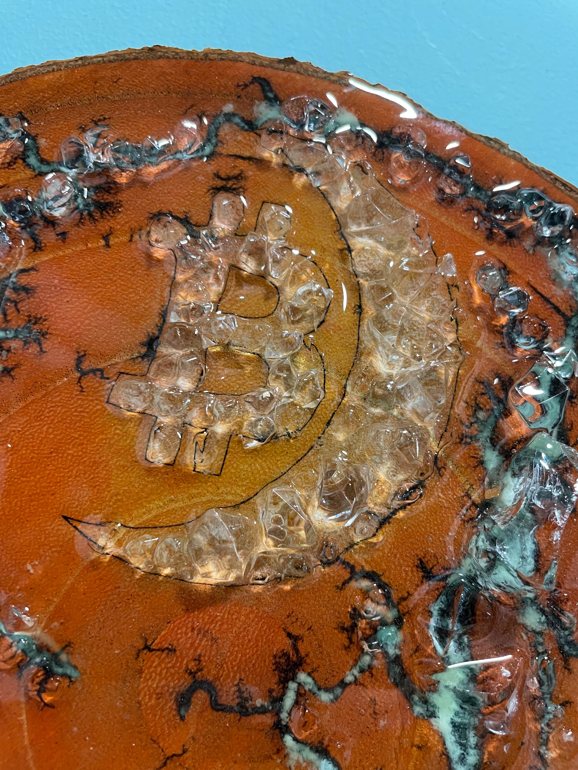 10-12” round. On wood stained orange. Lightning channels burned via 12,000 V of electricity. Glows in the dark. Bitcoin on the moon emerging hard as diamonds.