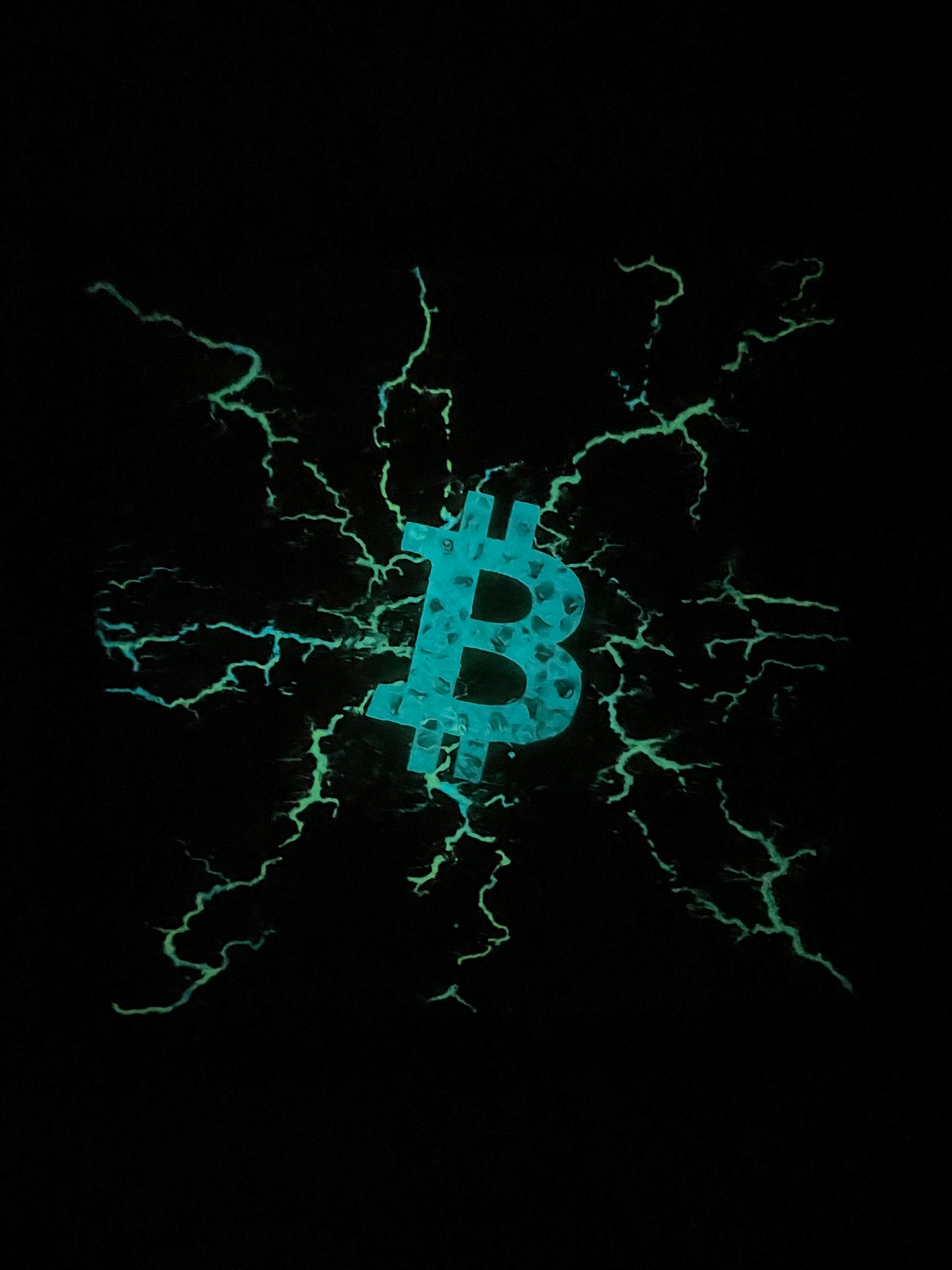 12” square. On wood. Beautiful Bitcoin orange with radiating lightning. Epoxy resin finish. Glows in dark.