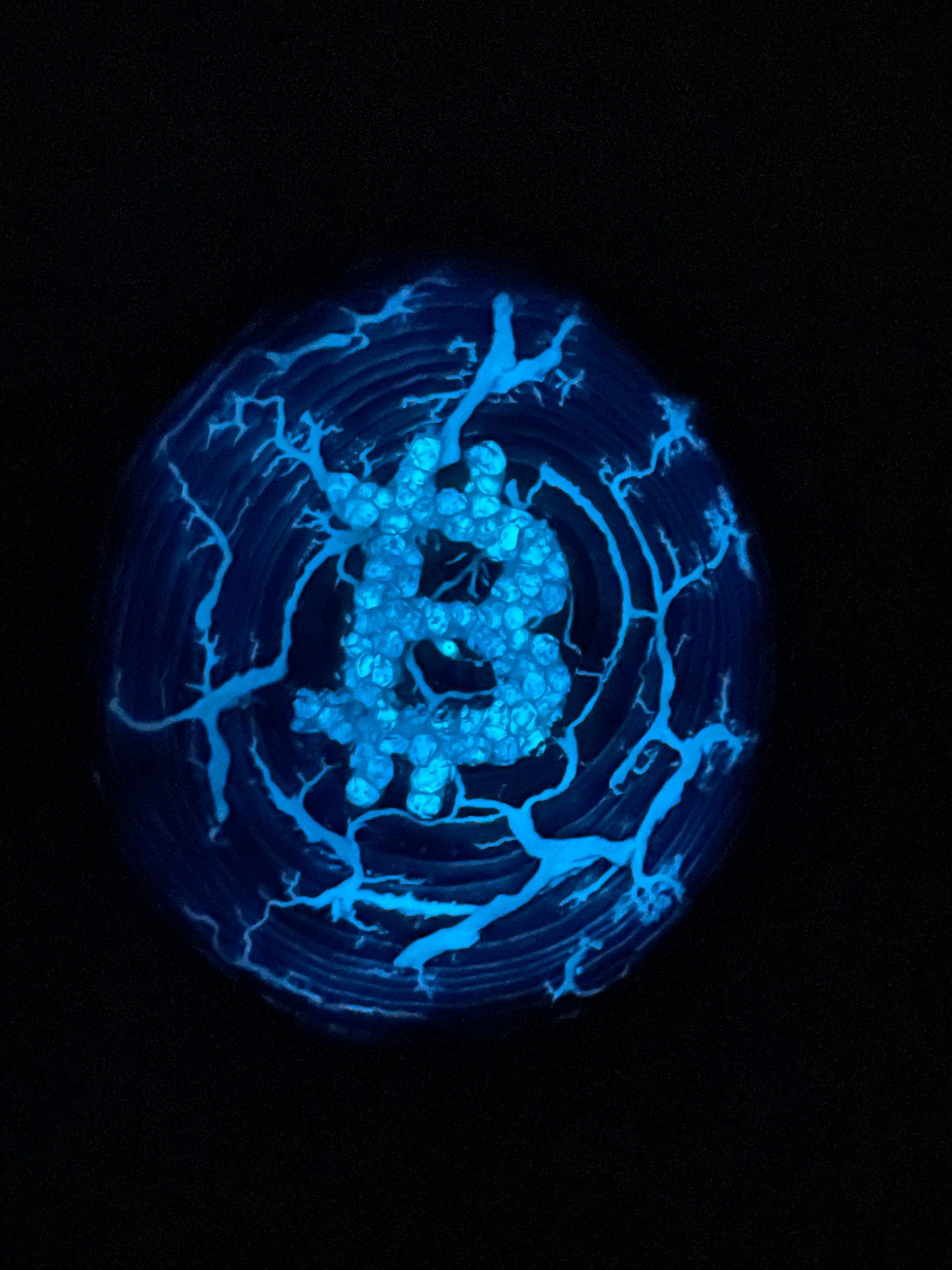 A stunning piece with all the Essence of Bitcoin style; this piece stands out boldly on its own during the day, with just a hint of orange shown throughout. At night, it really shows Bitcoin and the lightning network and it will glow in the dark all night long!