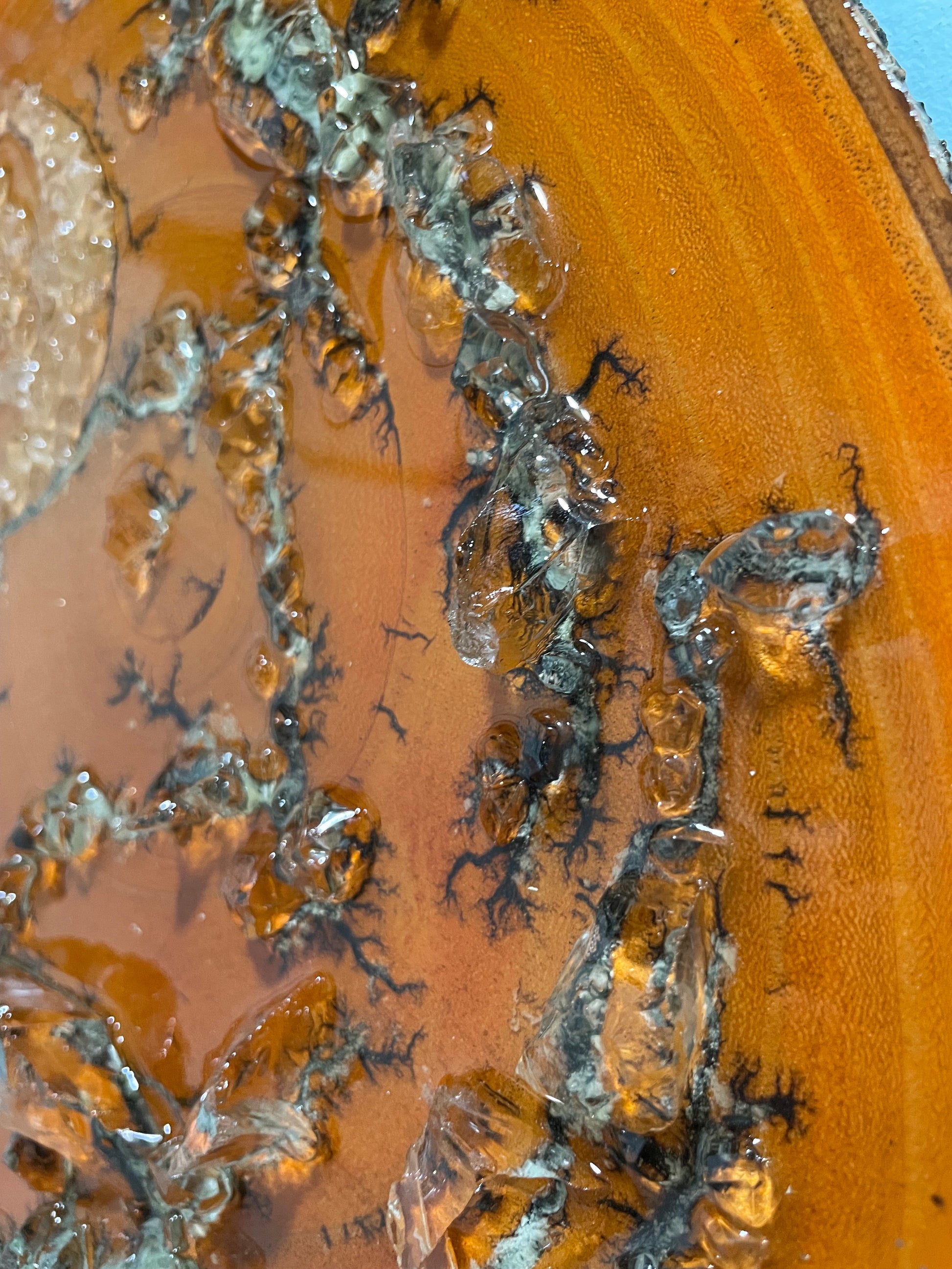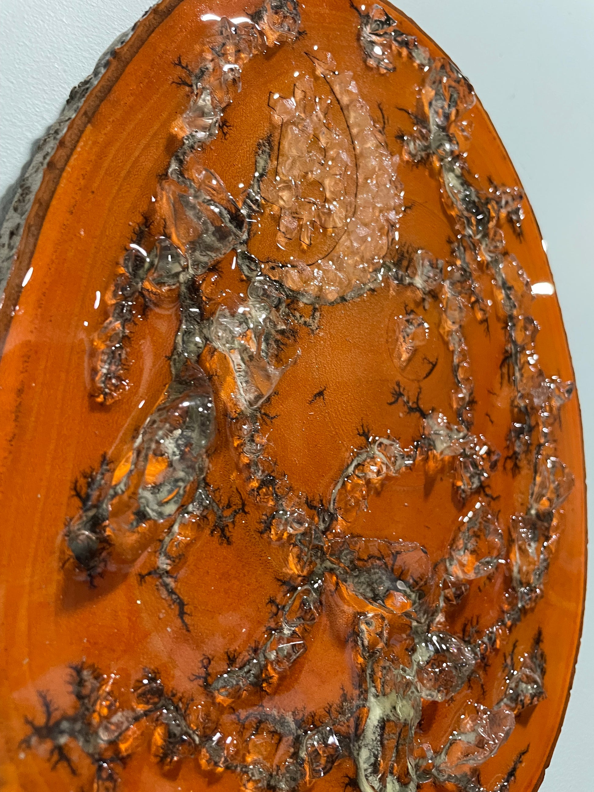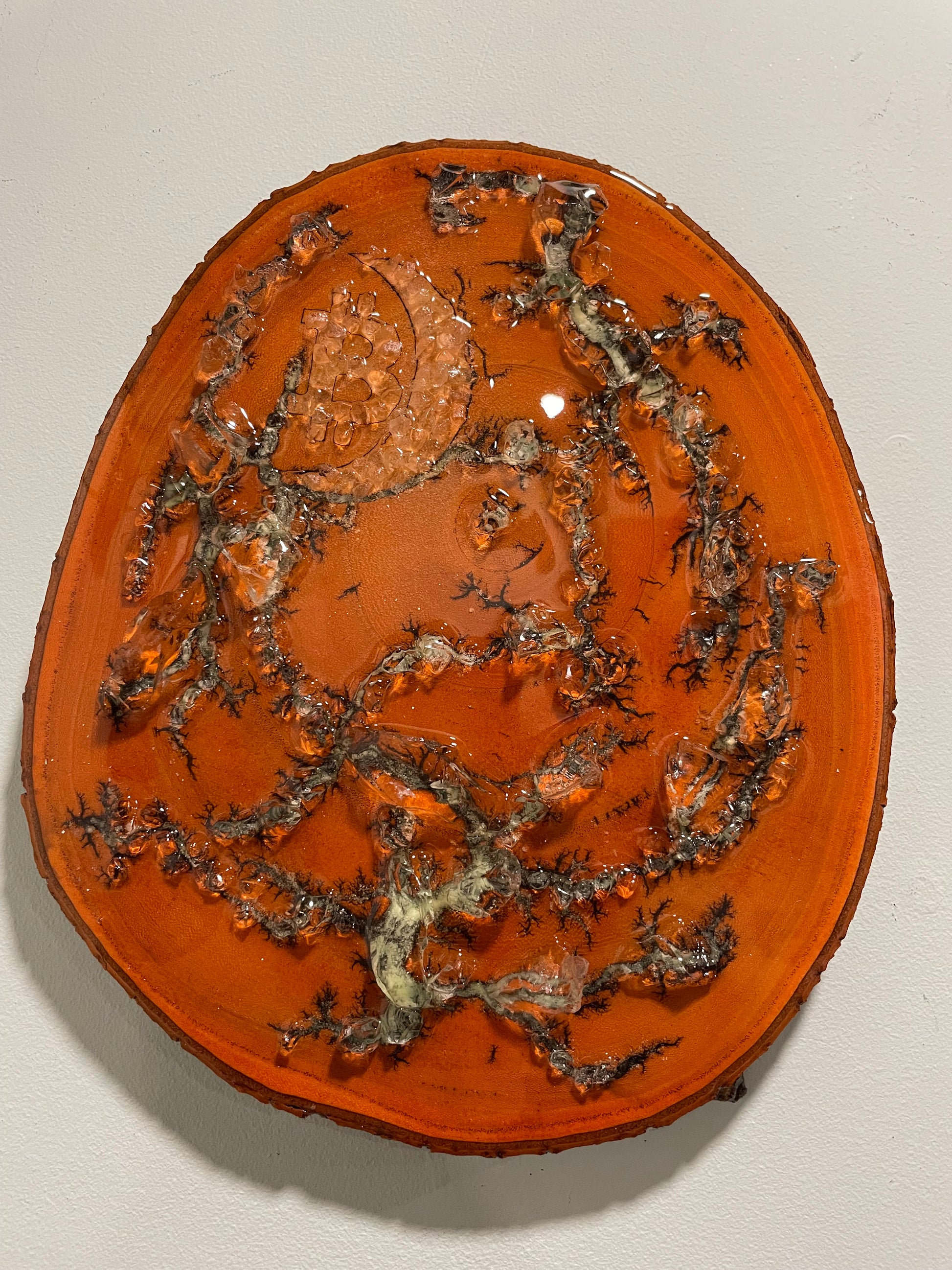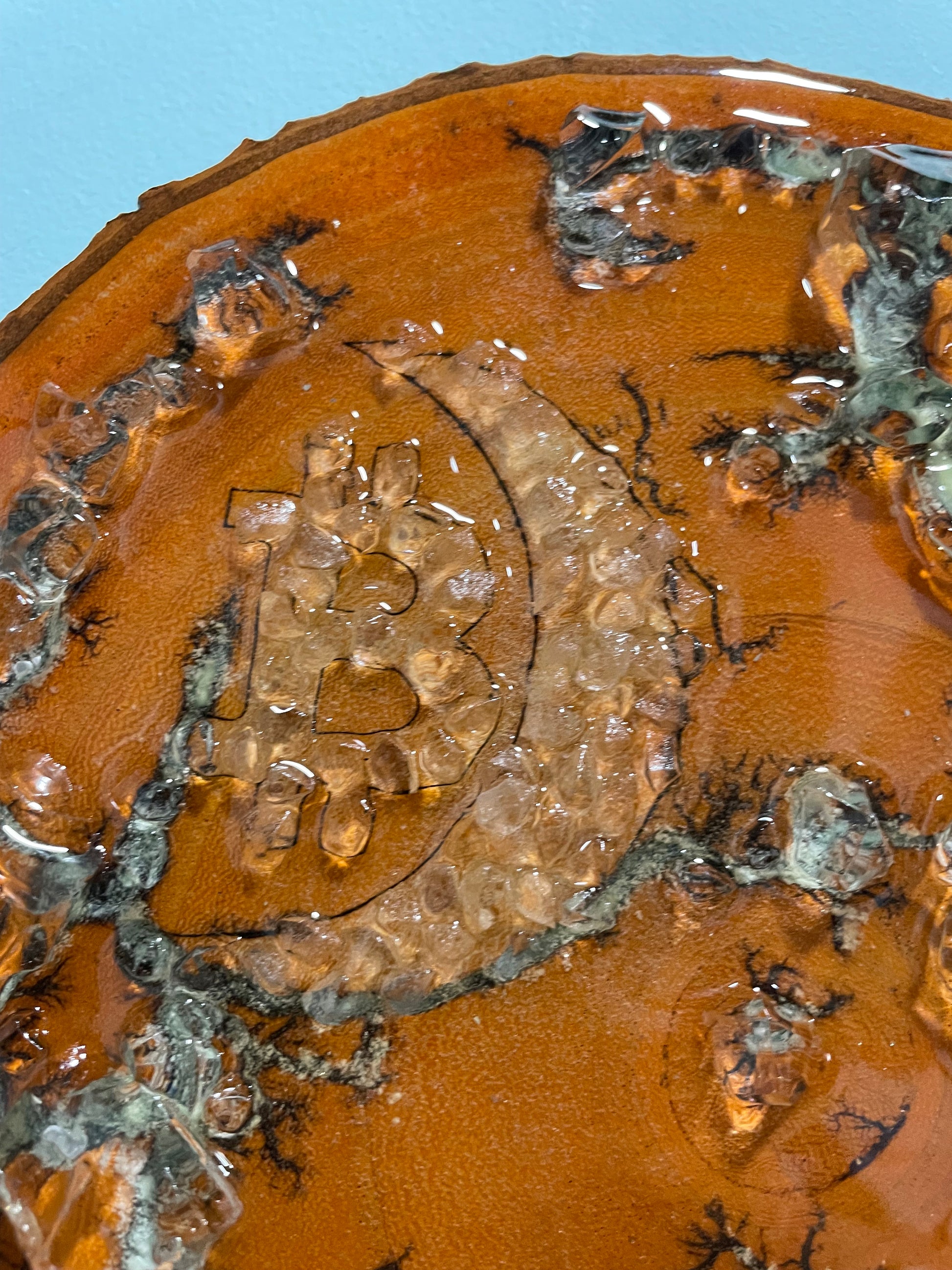 10-12” ~round. On wood. Bitcoin on the Moon, covered in “gems”. Lightning channels burned via 12K volts of electricity. Glows the dark.