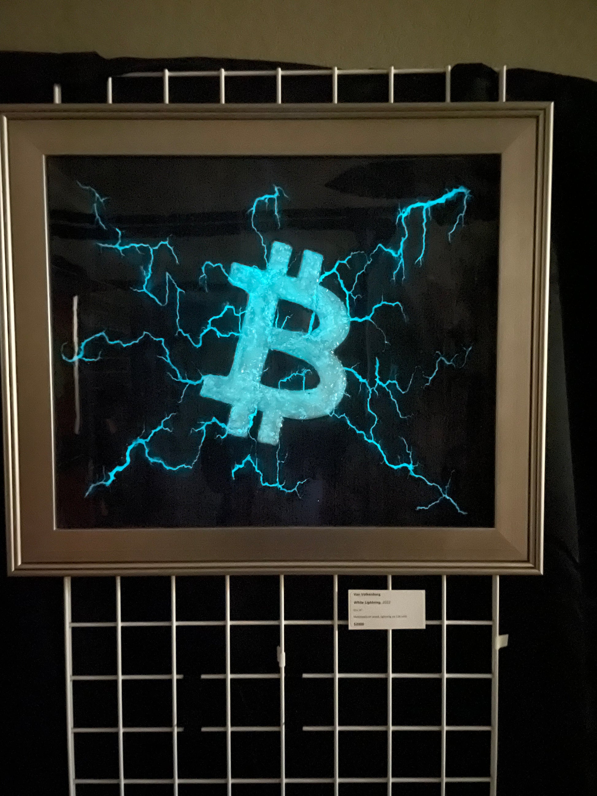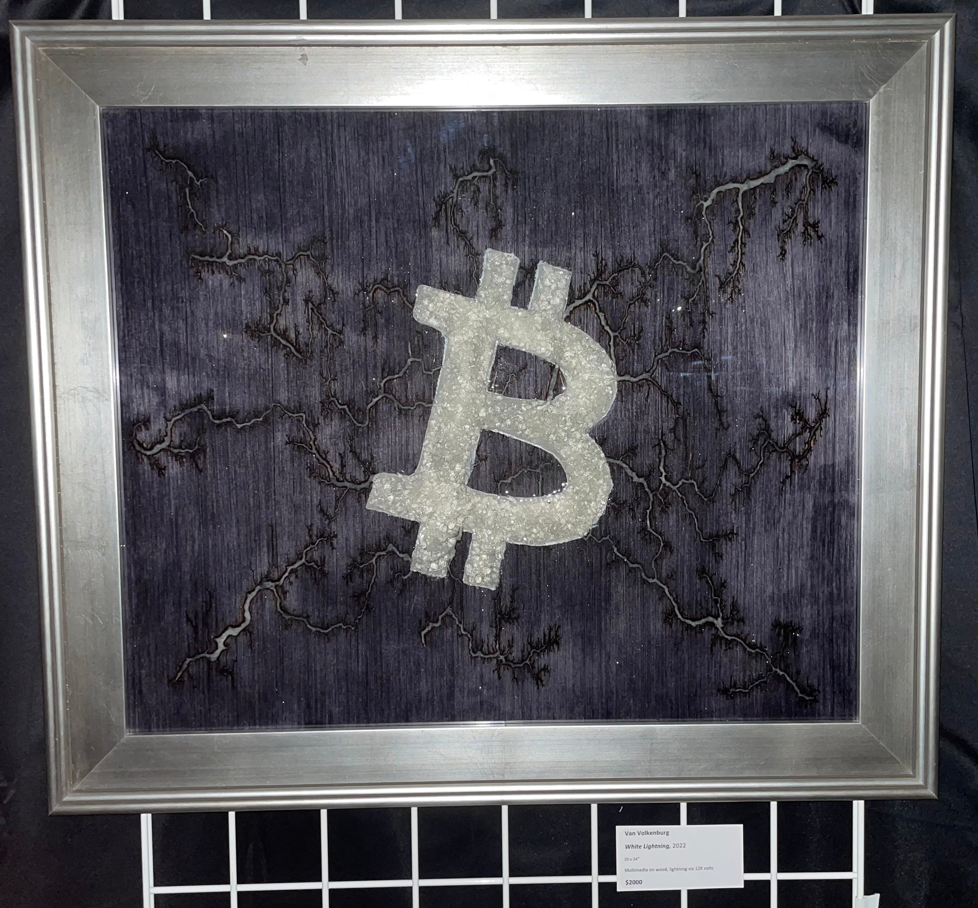 Just like Bitcoin takes energy to be created, so does our art. The base layer is wood, we use 12,000 volts of electricity to burn the “lightning channels”.